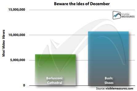 È stato già fatto notare come un anno esatto fa accadde qualcosa di simile, ovvero l'aggressione a mezzo scarpa subita dall'allora presidente degli Stati Uniti George Bush Jr., filmata anch'essa dagli organi di stampa e poi diffusa in rete e a quel punto diventata meme. Le differenze tra i due eventi non stanno solo nella risonanza ma anche nella sostanza: una probabile contusione sventata e un incidente realmente avvenuto con rischio di danni ben più gravi e relative conseguenze sul clima politico. È stato allora VisibleMeasures a rilasciare uno studio semplice ma efficace secondo il quale in pochissime ore il video dell'incidente si è moltiplicato in 300 versioni diverse attraverso la rete e solo il giorno dopo le clip erano diventate 900. La7, che è stata la prima ad avere immagini chiare dell'accaduto, non è stata sufficientemente accorta da mettere online le immagini e catalizzare sul proprio video le visualizzazioni arrivate (sommando tutte le clip) quasi a 6 milioni in tutto il mondo. In confronto, sempre secondo VisibleMeasures, le molte clip di George Bush jr. che schiva la scarpa sono state viste 10 milioni di volte.